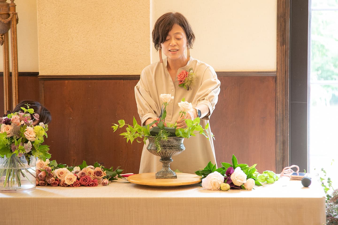 この教室でアレンジメントを習いたい!と思ったきっかけはホームページの写真でした。ナチュラルな雰囲気のアレンジメントがとっても素敵でした。どうせやるなら資格も取りたい!と思っていたので、カリキュラムを組んで頂き、月一ペースで習えるのはとても魅力的でした。実際に通ってみて、先生の技術や人柄はもちろん、他の生徒さんも良い方ばかりでとても楽しいです!カリキュラムのアレンジだけでなく、季節にあったイベントなどここでしか出会えないようなものがたくさんあります○お仕事で疲れた後も、やっぱりお花を見ると元気になれるので日々の楽しみになっています!